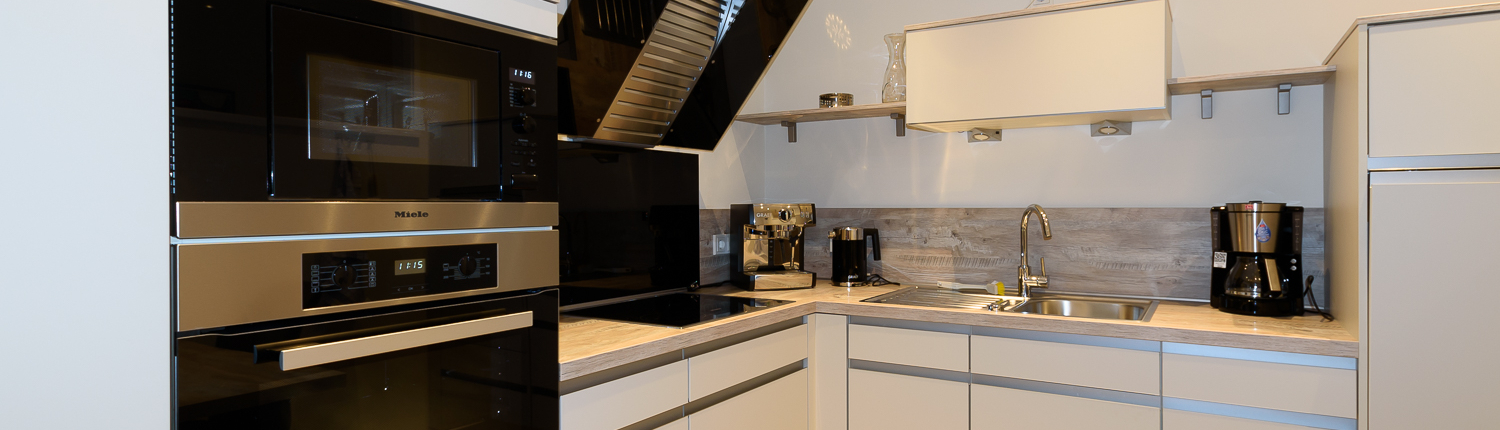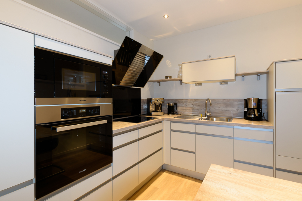 Wohnzimmer und Küche sind durch eine offene Bauweise verbunden.
